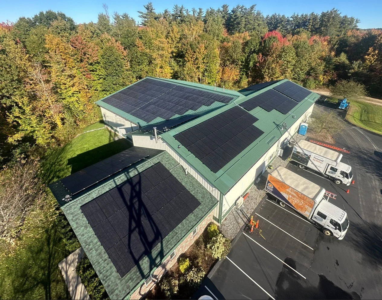 Solar Install: 60kWac, 97 Trina panels with optimizers, 4 SMA inverters, 3-week installation with partner Barrington Power.